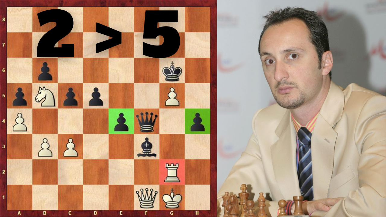 Right after making the sacrifice, Topalov has 3 pawns for a rook but at a certain point he only gets 2 pawns for a rook yet he’s the one pushing for a win!