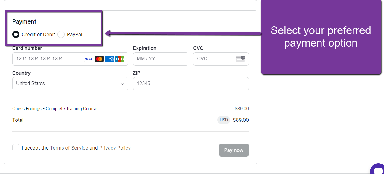 Enter your payment details, click on "I accept the Terms of Service and Privacy Policy" and click on "Pay Now".