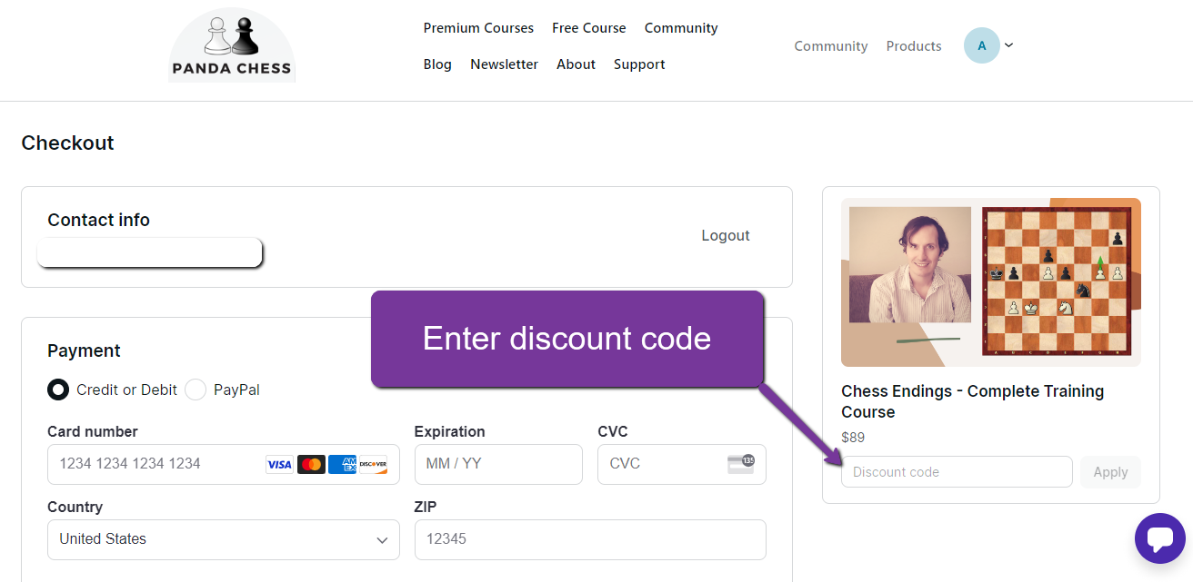 1) Go to the course page https://www.panda-chess.com/chess-endings-complete-training-course and click on "Enroll Now". You’ll be asked to enter your email to login or create an account.
