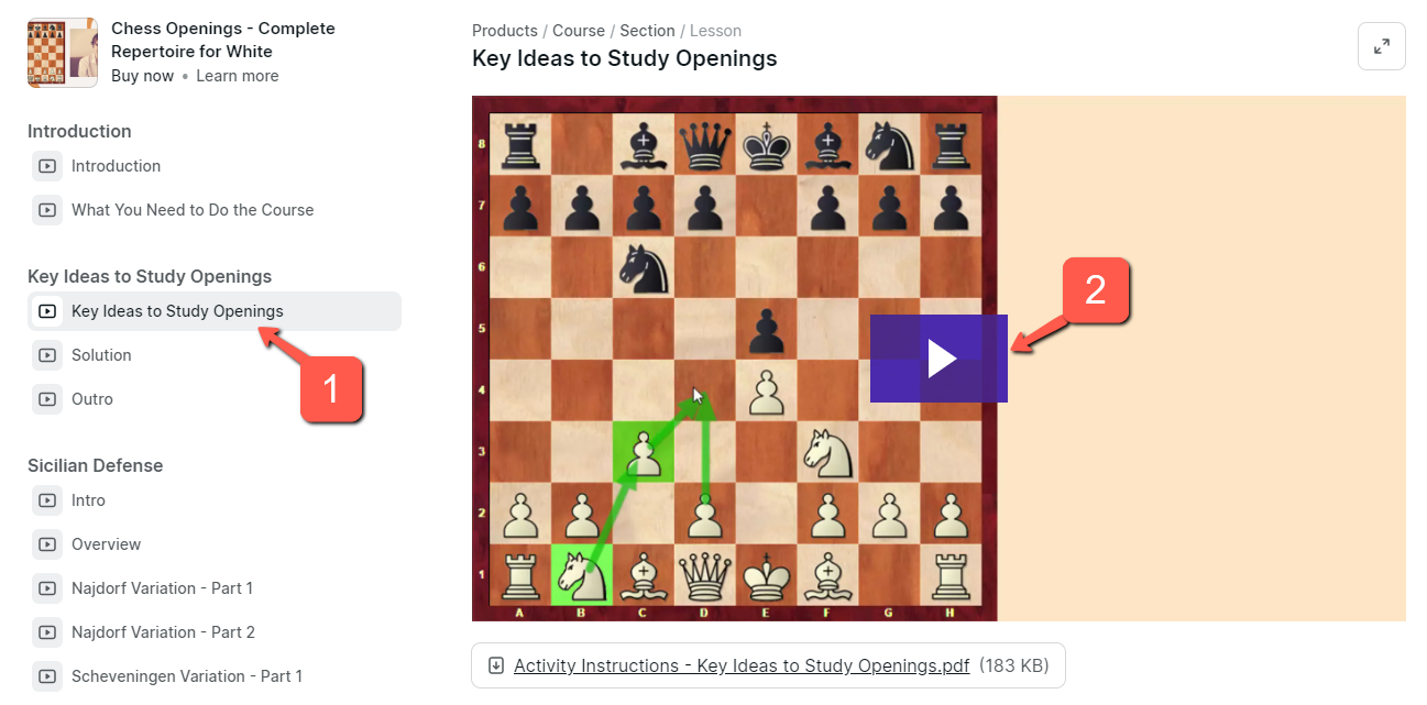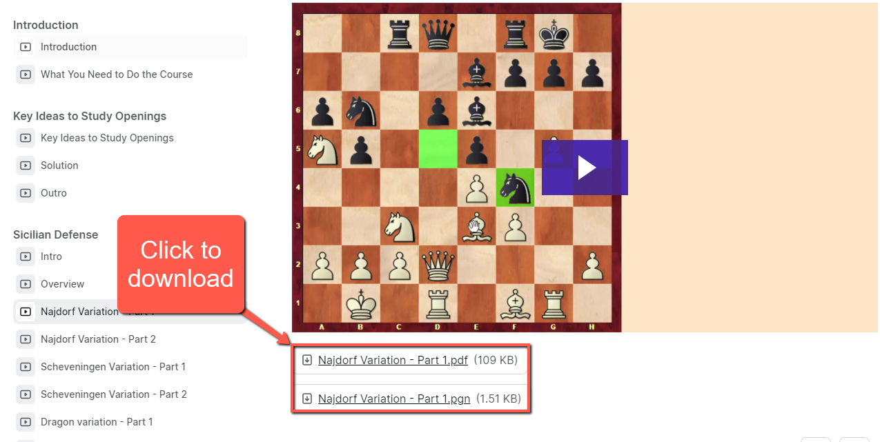 All the lines and games that I cover in the course will be provided to you under each lesson. For your convenience, I’ll provide them in 2 different formats: PDF and PGN. PGN (Portable Game Notation) is a standard format for recording chess games supported by most chess software.