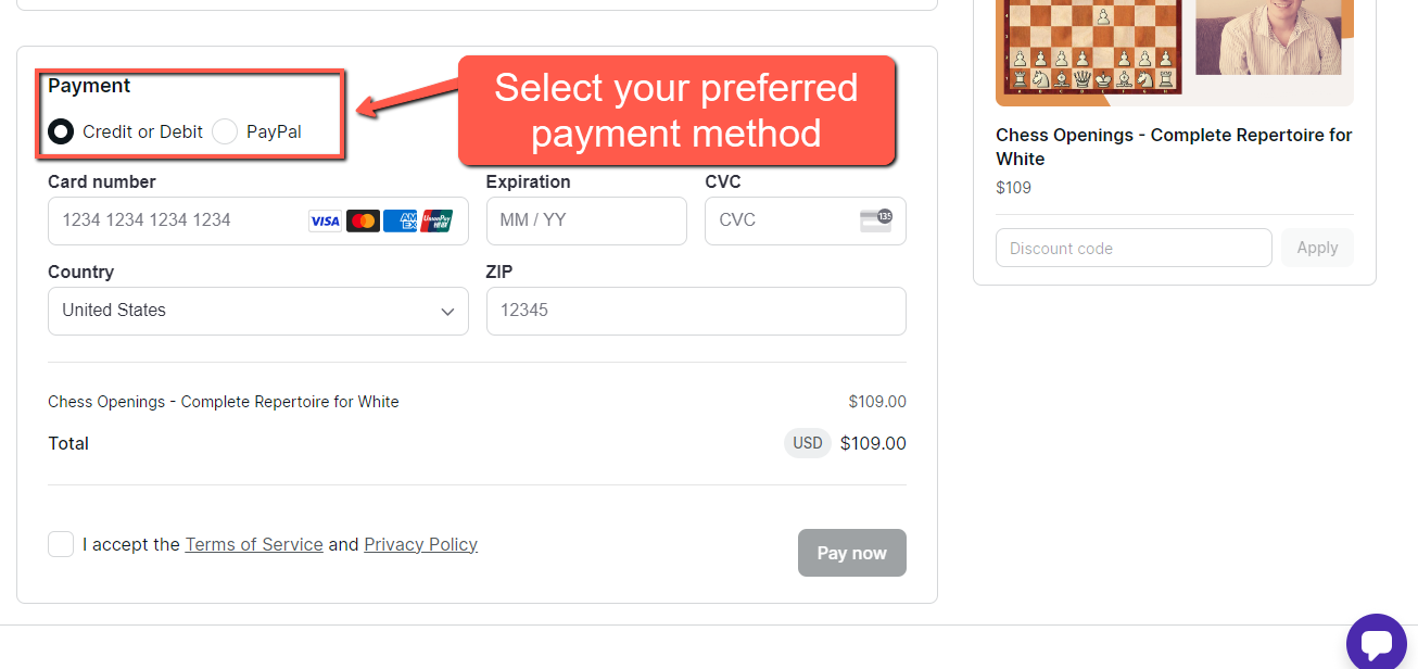 Enter your payment details, click on "I accept the Terms of Service and Privacy Policy" and click on "Pay Now".